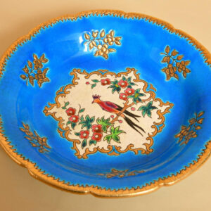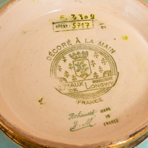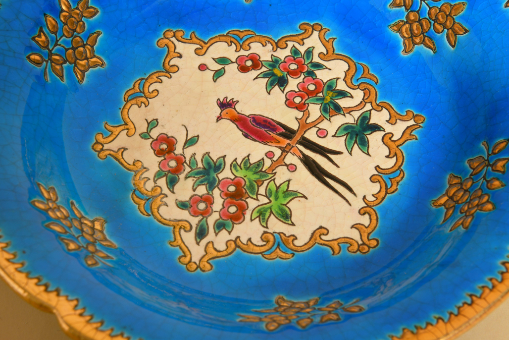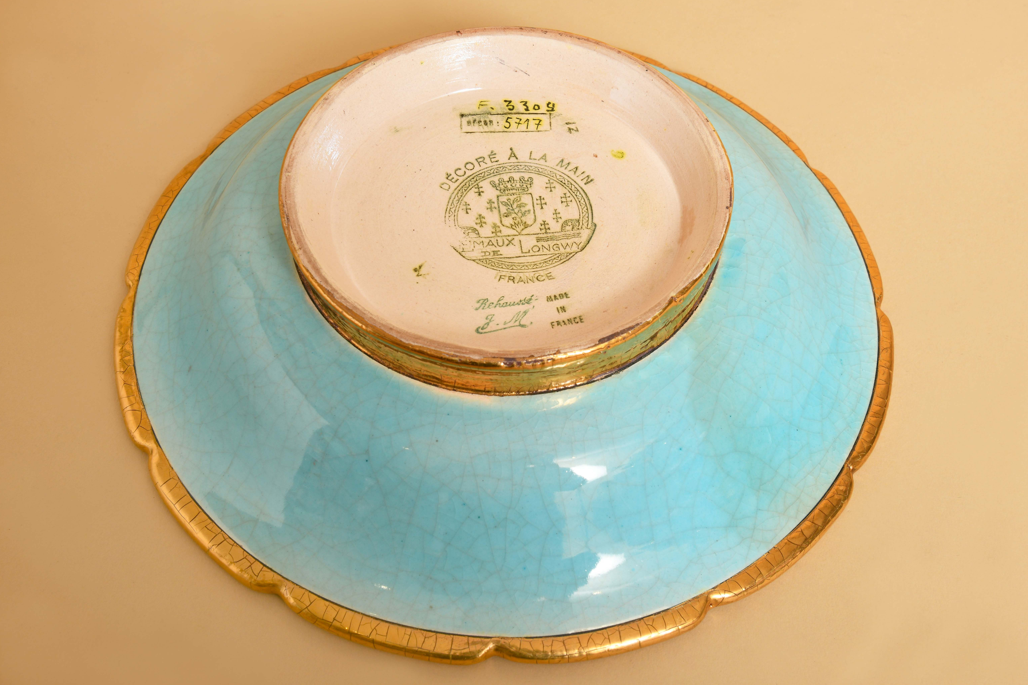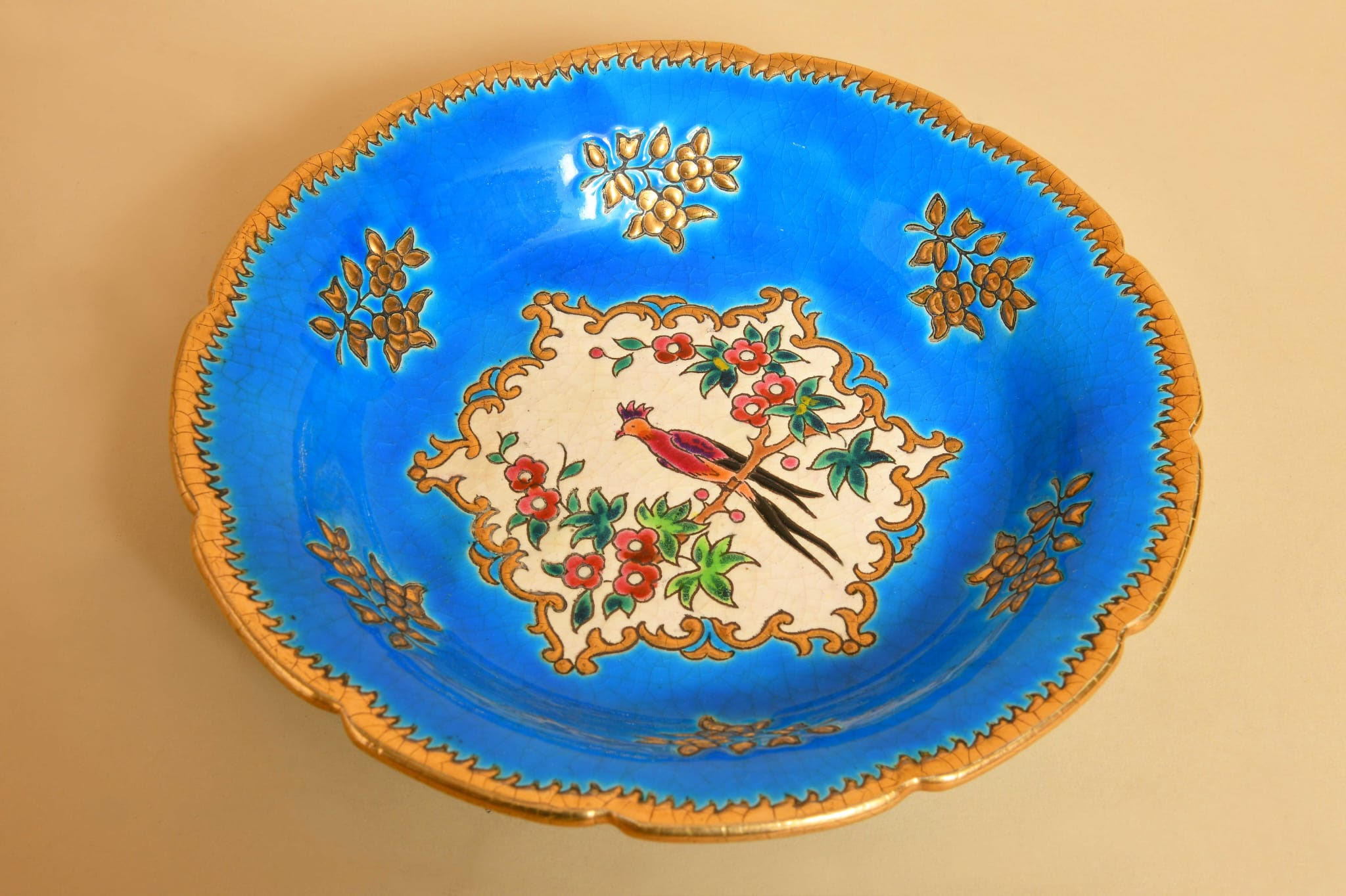 Belle assiette décorative en faïence de Longwy, réalisée selon la technique emblématique des émaux cloisonnés. Elle présente un fond bleu intense rehaussé de motifs dorés et un cartouche central finement décoré d’un oiseau perché parmi des fleurs, d’inspiration orientale.