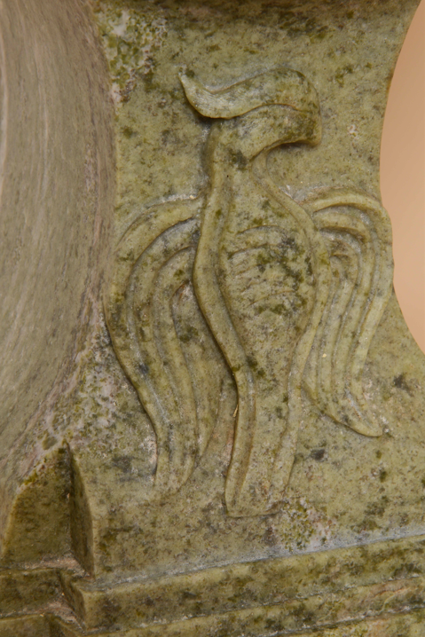 Le visage, sculpté dans un marbre blanc lumineux, respire la sérénité et la grâce. Les cheveux et les étoffes sont travaillés dans un marbre vert sauge nervuré, apportant contraste et profondeur, tandis que de légers accents rosés viennent souligner la carnation et les détails du buste, ajoutant une touche de chaleur subtile.