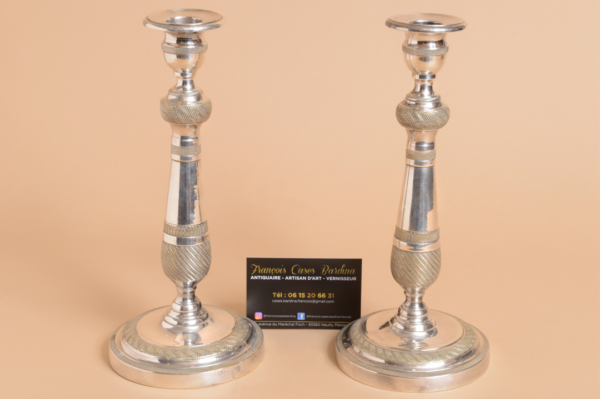 Cette jolie paire de bougeoirs en bronze argenté séduit par l’harmonie de ses lignes et la finesse de son travail. Le design sobre et équilibré évoque les codes du style classique, avec une silhouette élancée, un fût joliment tourné et une base stable au décor discret.