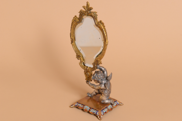 Petit miroir en bronze doré et argenté – Ange porteur, socle émaillé – miroir chantourné et biseauté