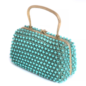 Ce sac à main élégant, datant des années 1970, se distingue par sa broderie fine agrémentée de perles en plastique bleu, qui lui confèrent un charme rétro tout en apportant de la texture et du relief à l’ensemble, offrant ainsi une allure à la fois classique et moderne.