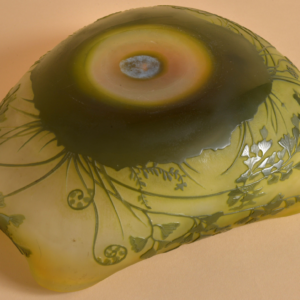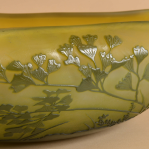 Pièce d’exception, cette superbe coupe signée Émile Gallé illustre tout le raffinement de l’Art nouveau. Réalisée en verre multicouche gravé à l’acide, elle présente un délicat camaïeu de tons verts et jaunes, évoquant la nature lumineuse et poétique chère à l’artiste nancéien.