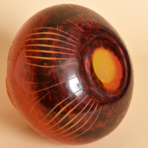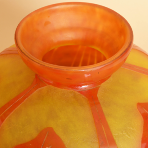 Élégant vase en verre multicouche signé Le Verre Français, orné du fameux décor Feuilles de Tabac. Sa silhouette harmonieuse met en valeur un fond orangé lumineux, délicatement nuancé, sur lequel se déploient de larges feuilles stylisées, typiques de la production Art Déco de Charles Schneider.