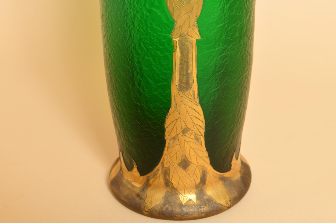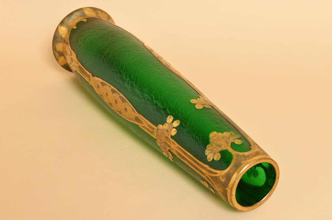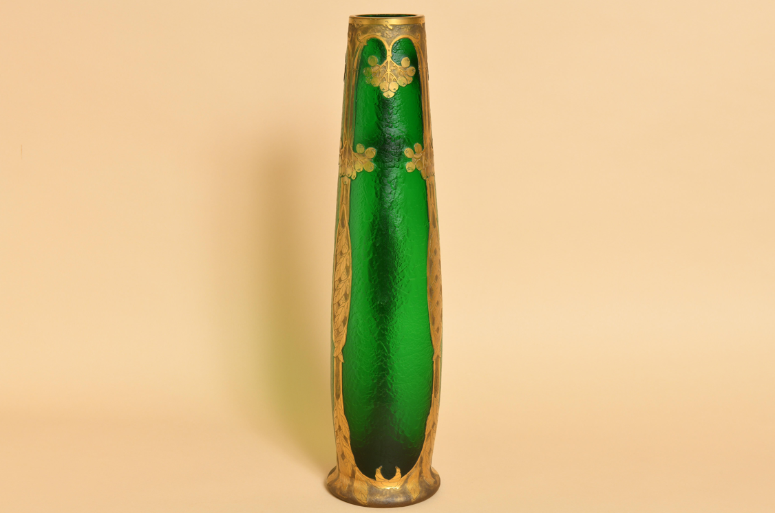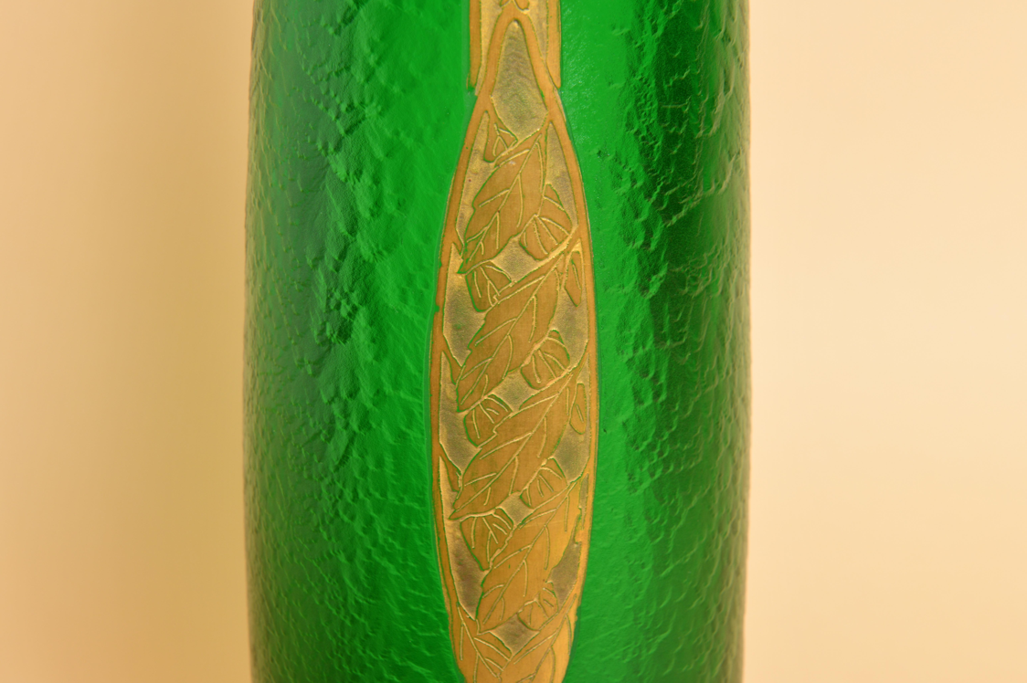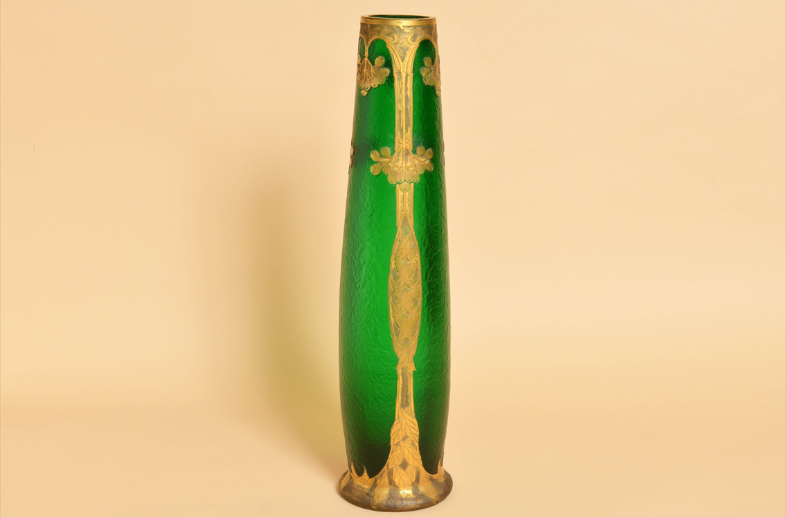 La décoration aux feuilles d’or, appliquée avec finesse, apporte une touche précieuse et décorative, jouant avec la lumière et soulignant l’élégance des formes. L’ensemble témoigne d’un savoir-faire artisanal d’exception, caractéristique des créations décoratives de la fin du XIXᵉ et du début du XXᵉ siècle.